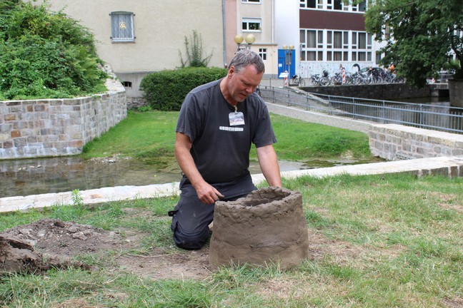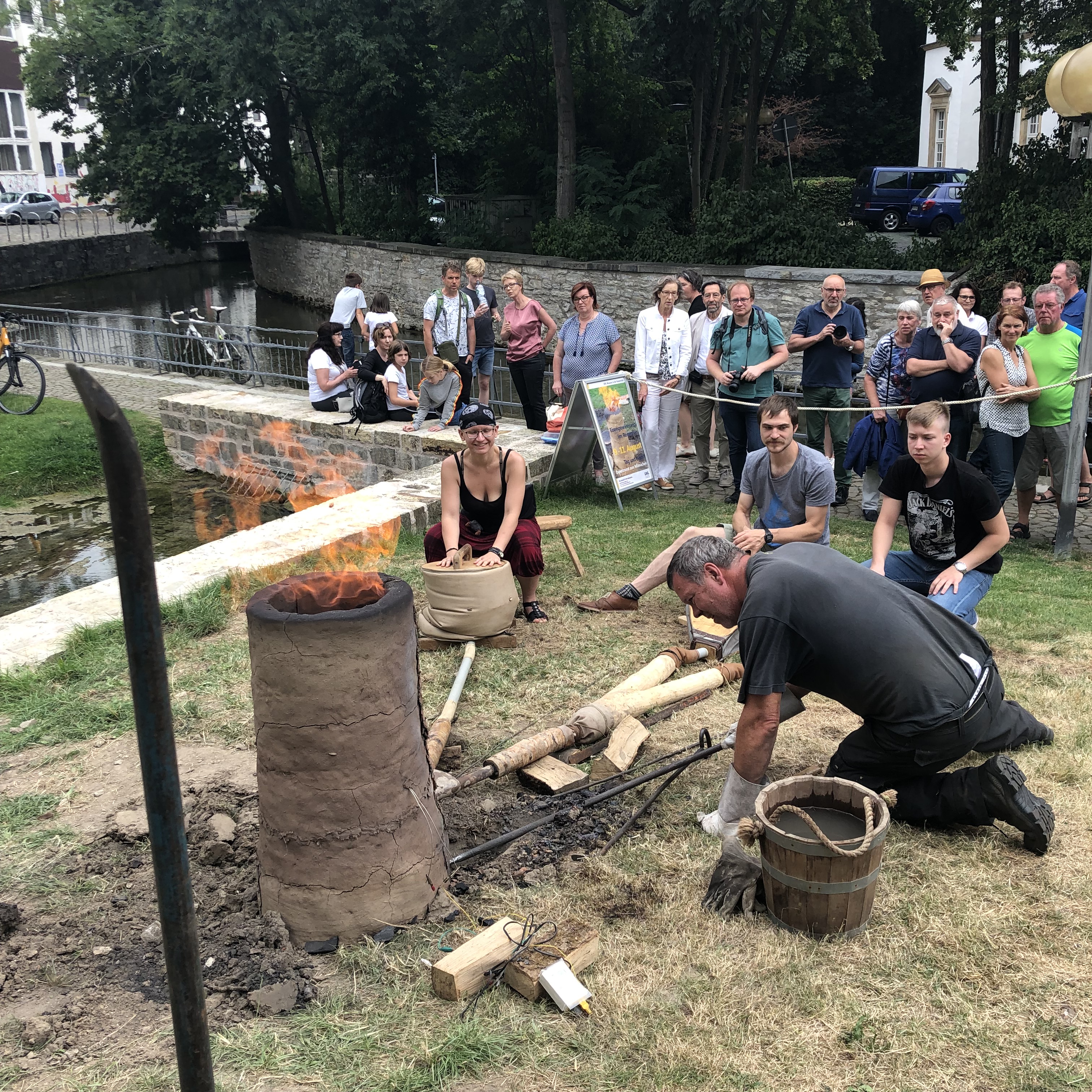 Eine Gruppe, die einen brennenden Lehmschlot mitten in der Stadt aufbaut, blieb auch von den übrigen Paderbornern nicht lange unbemerkt. Ein immer wechselndes Publikum bereicherte den Tag und nahm dem Team einige Arbeit ab. So fanden sich immer wieder kleine und große Helfer, die den Ofen weiter bauten oder mit ganzem Körpereinsatz die Blasebälge betätigten. Wer zusammen arbeitet kommt auch miteinander ins Gespräch. Und da die wenigsten viel von mittelalterlicher Eisenverhüttung wissen, ging es hauptsächlich darum. Unsere Kollegen vom Sachsenhof hatten reichlich Anschauungsmaterial dabei, um die vielen Nachfragen der Besucher zu beantworten. So gab es vom Erz bis zum fertig geschmiedeten Stück Eisen alle Stufen der Eisenverhüttung zum Ansehen und Anfassen. Die wichtigsten Fragen waren wohl: Wie funktioniert der Rennofen, was sind überhaupt Erz, Eisen und Schlacke und wie trennen sich Eisen und Schlacke? Zunächst eine kurze Einführung in die Begrifflichkeiten: als Erz bezeichnet man ein metallhaltiges Mineral, in unserem Fall meint Erz Eisenerz. Durch Erhitzen des Erzes trennt sich das Metall von den übrigen nichtmetallischen Bestandteilen. Dieses Abfallprodukt ist die Schlacke. Den gesamten Vorgang der Metallgewinnung aus Erz heißt Verhüttung.